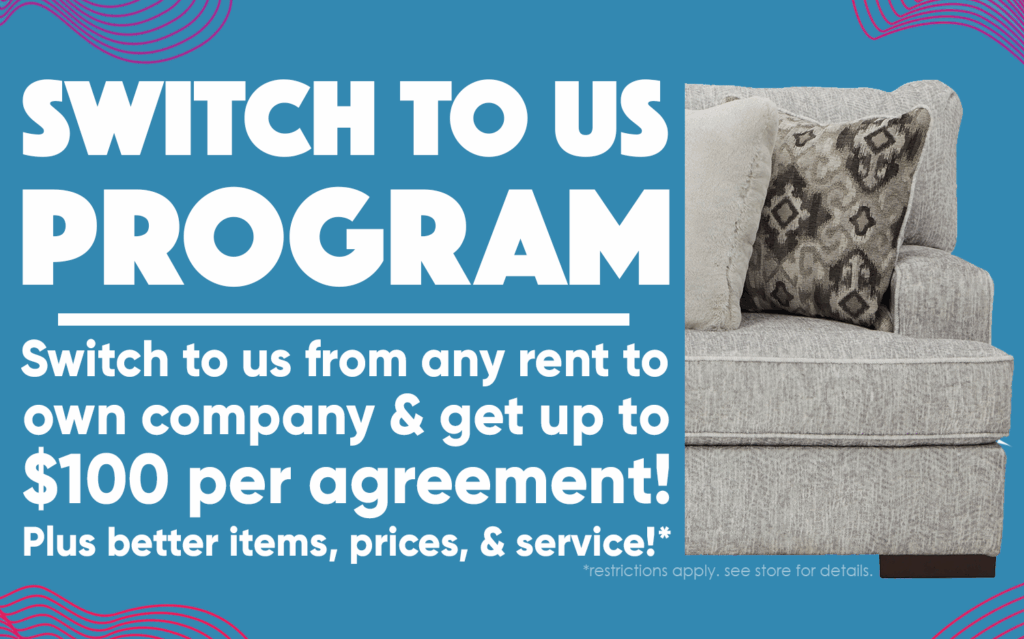 *See store for complete item selection and pricing information. Submitting a request, quote, or application online does not guarantee item availability or the purchase of any item. Our EZ rent to own purchase agreements (EZ purchase plans) are labeled and signed as a “RENTAL PURCHASE AGREEMENT” on account. New rental purchase agreements require a completed and approved application. Applications and updated applications are subject to verification and can be approved or denied at any time by our team. New rental purchase agreements may require a $20 processing fee. See the specific rental purchase agreement for the complete terms and conditions of the agreement which includes: payment amounts, payoff options, new product replacement program (new product guarantee), and item upgrade/return options, and more. Delivery: is free within a 30 miles radius or as determined by our staff. Set up is free within the determined time frame by our staff. Item service: only applies to active rental purchase agreements and does not cover purposeful/accidental damage or item neglect. All Switch To Us bonuses will be applied to the customer’s account profile. This amount can be used at any time. The amount can be applied to active/new rental purchase agreements or new cash sales on the customer’s accounts. This amount is only given to the customer when a new rental purchase agreement is signed, the first monthly payment has been made, and the corresponding competitor agreement is closed. For new Switch To Us bonuses to be accepted the store location must be notified of the Switch To Us request via web form, phone call, email, or in-store. The customer Switch To Us bonus offer expires within 90 days after the new customer’s new rental purchase agreement has been created. Customers must be in good standing to qualify. Agreement savings and item selection is not guaranteed. Item pricing and availability may vary by store. All new switch to us bonuses are subject to owner review and may or may not be accepted at any time. All referral cash bonuses will be applied to the customer’s account profile that provided the referral. This amount can be used at any time. The amount can be applied to active/new rental purchase agreements or new cash sales on the customer’s account that provided the referral. The referral bonus amount will be applied to the customer’s account as stated above only when the referred new customer has signed a new rental purchase agreement and the referred new customer has received their item(s). Both customers must be in good standing to qualify. For new referrals to be accepted the store location must be notified of the referral via web form, phone call, email, or in-store. The customer referral bonus offer expires within 90 days after the referred new customer’s new rental purchase agreement has been created. Previous or current customers cannot be referred. Referrals from current employees may or may not be accepted. All new referral bonuses are subject to owner review and may or may not be accepted at any time.