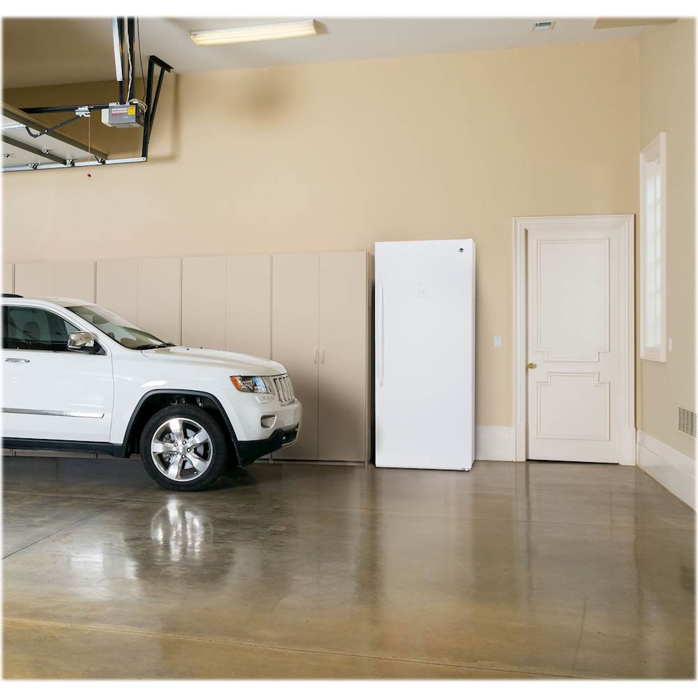 Store frozen foods in bulk with this 21.3 cu. ft. frost-free GE upright freezer. The exterior temperature control knob lets you make adjustments without opening the door, and the audible temperature alarm alerts you to any potential problems. This lockable GE upright freezer works in temperatures between 0-110 degrees Fahrenheit for convenient outdoor use.