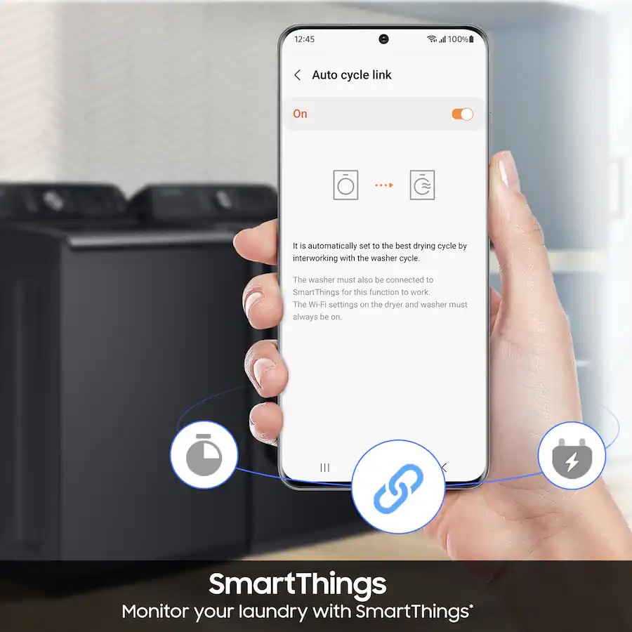 Wi-Fi connected so you can receive end-of cycle alerts, remotely start or stop your drying, schedule cycles on your time, and more, right from your smartphone with the SmartThings App.¹